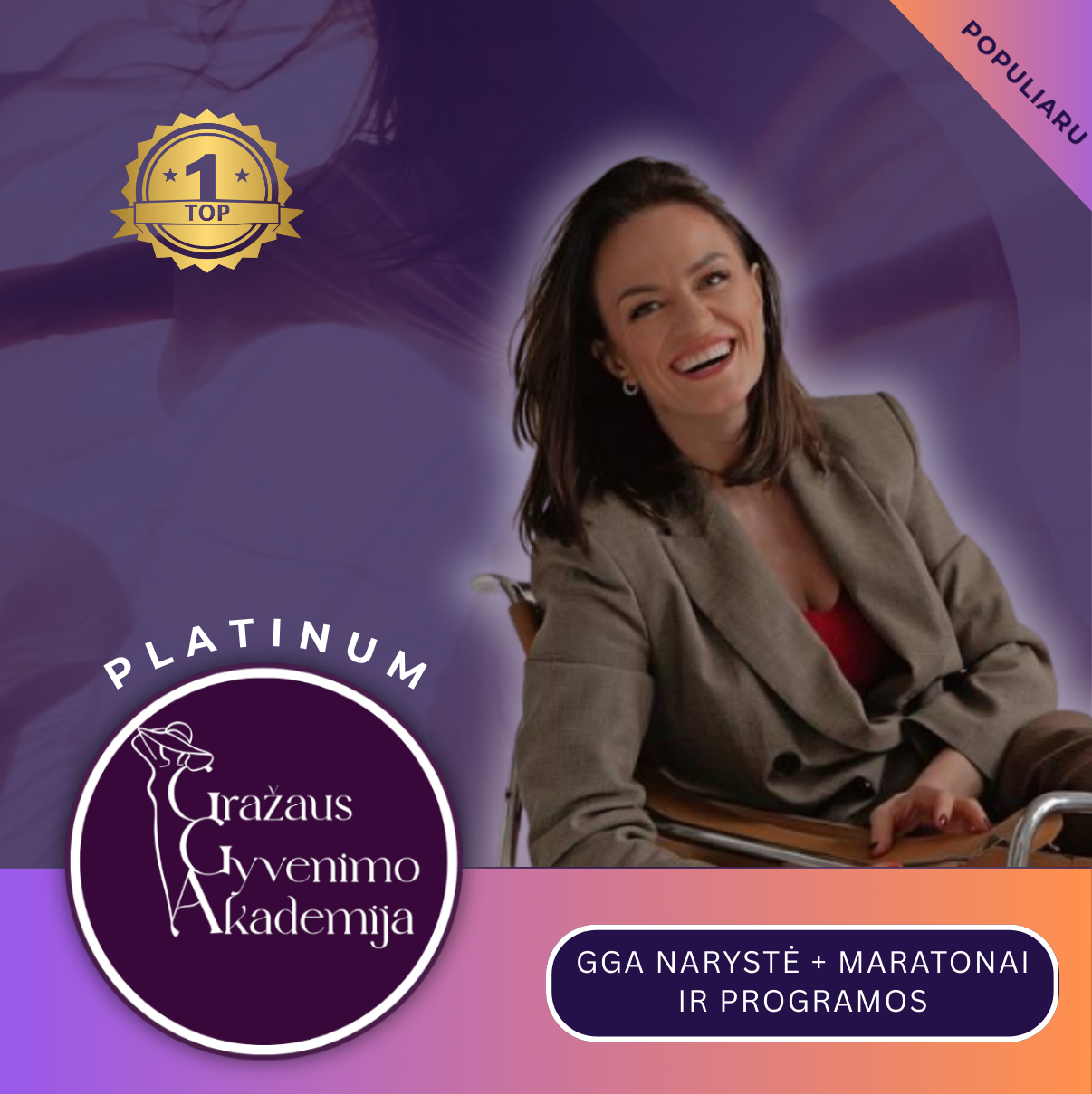 NET 80% moterų, įsigijusių vieną mano produktą, vėliau įsigyja ir kitus.   Tad po ilgo kūrybos, testavimo ir narių istorijų išklausymo, nusprendžiau apjungti visus savo projektus į vieną galingą sistemą, kuri nuo šiol bus prieinama tik GGA narėms. Viskas, ką mėgsti labiausiai – po vienu stogu!   Ką tai reiškia?   NUO ŠIOL, ĮSIGIJUS MĖNESINĘ GGA NARYSTĘ TU TURĖSI PRIEIGĄ NE TIK PRIE AKADEMIJOS VEIKLŲ, BET IR PRIE TO MĖNESIO MARATONO AR NET HARMONIJOS PROGRAMOS, PRIKLAUSOMAI NUO TVARKARAŠČIO PAGAL MĖNESĮ. TAIP! VIENA NARYSTĖ – VISOS VEIKLOS IR PROGRAMOS VIENOJE VIETOJE.       Tavęs narystėje laukia: